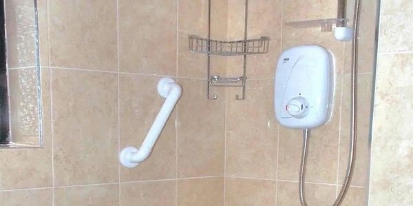 Renovated bathroom with wet floor shower, new wash basin, and new toilet.